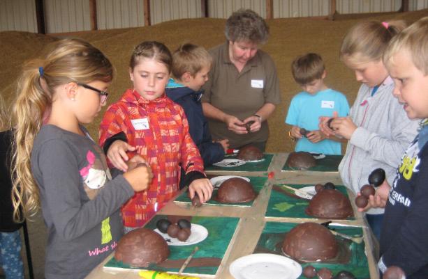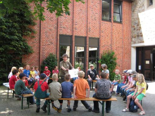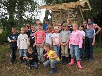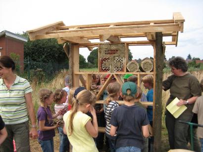 Danach erfuhren die Kinder, wie der jährliche Lebenszyklus unserer Wildbienen abläuft. Hierfür hatte Theresia Lietmann etliche Zeichnungen vorbereitet, die das Brutgeschäft der Wildbienen darstellten. So lernten sie, daß ein einzelnes Weibchen die Brutkammern baut und den Pollen sowie Nektar einträgt. Heute wissen die Kinder auch, dass sie an dem Verschluss der Zimmertür erkennen können, wer dahinter wohnt.