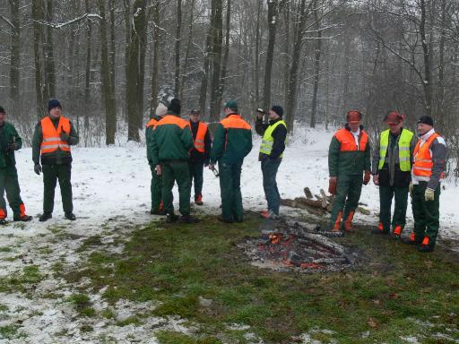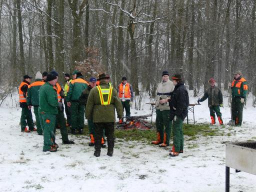 Nach zwei Tagen Theorie folgte am Samstag (09.01.2010) der praktische Teil. Hier ging es unter anderem um das richtige Aussuchen und Vorbereiten der zu fällenden Bäume. Auch das ist wichtig, um die Fallrichtung des Baumes festzulegen und lauernde Gefahren so weit wie möglich auszuschalten.
