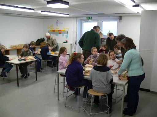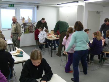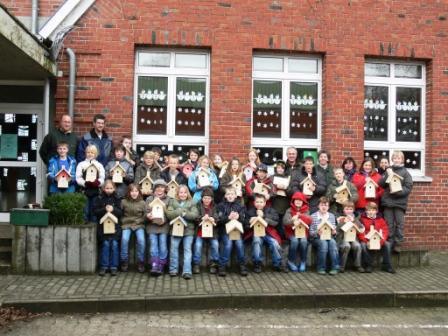 Damit es nicht zu schwierig wird, hat das „Schrauberteam“ des Hegerings, das an diesem Tag aus Ingo Möller, Alwin Wiggering, Rudolf Merten, Hendrik Lütke-Bexten, Jochen Schmidt und Elmar Lietmann besteht, komplett fertiggesägte Bausätze für die Nistkästen mitgebracht. Unter Anleitung der Experten werden die vielen einzelnen Teile noch ein bisschen angeschmirgelt und dann mit dem Akkuschrauber zusammengefügt. Dabei haben nicht alle Kinder so wie Anna schon mal mit ihrem Vater mit Holz gewerkelt. Einige haben zum ersten Mal den Schrauber in der Hand und entsprechend Respekt vor der Aufgabe. Doch nach kurzer Zeit geht allen das Schrauben schnell von der Hand und so hält jeder Viertklässler am Ende der Schulstunde seinen fertigen Nistkasten im Arm.