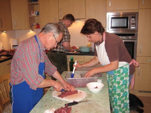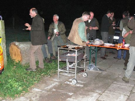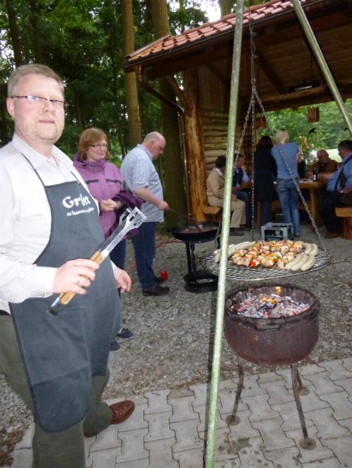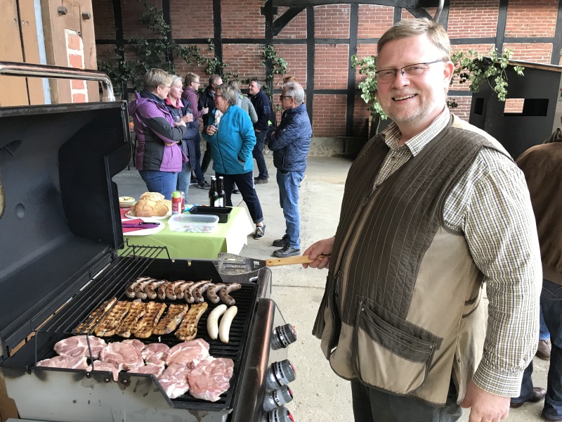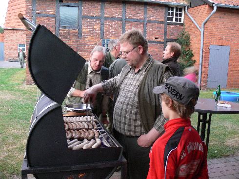 Im Anschluss ging es mit dem Rad weiter Richtung Müssingen zur Gaststätte „Zum Fensterberg“. Dort wurde zur Stärkung Kaffee und Kuchen gereicht. Der Ausklang fand in Einen auf dem Hof Lütke Streine statt. Hegeringleiter Elmar Lietmann übernahm die Leitung auch am Grill und versorgte die Gäste mit Spezialitäten. Hausgemachte Wildbratwurst von Sau und Reh war ein Highlight. Diese hatte Peter Dreimann vorab zusammen mit Bruder Thomas selbst hergestellt.