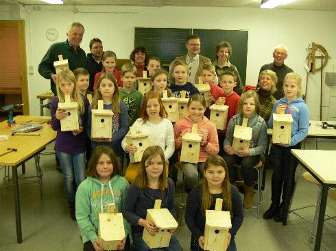Passend zum Frühjahr und damit der Zeit in der unsere Singvögel auf Wohnungssuche gehen, starteten die dritten und vierten Schuljahre der beiden Grundschulen in Milte und Einen unter der Leitung des Hegerings Milte-Einen eine Nistkastenbauaktion. Pro Klasse ging es in zwei Gruppen an die Arbeit. Dabei startete eine Gruppe direkt im Werkraum mit dem Nistkastenbau, die zweite Gruppe blieb in den Klassenräumen. Dort stand die Ausbildung zum Vogelkundler, zum sogenannten Ornithologen, auf dem Unterrichtsplan. Unter der Leitung von Waldpädagogin Theresia Lietmann erforschten die Schüler wie man die Vögel unterscheidet, wie ihre Nester aussehen und wie man sie ohne zu stören beobachten kann. Hier gestaltete sich die Schüler und Schülerinnen ein eigenes Mini-Vogellexikon, zur schnellen Bestimmung einiger heimischer Singvögel. Während im Klassenraum noch so manches Vogelei betrachtet wurde, waren aus dem Werkraum schon die Geräusche der Akkuschrauber zu hören. Für diese Bauaktion hatten sich einige Schüler bereits im Vorfeld vorbereitet. Gemeinsam mit ihren Eltern waren sie in die heimische Werkstatt gegangen, um dort vorab den richtigen Umgang mit dem Akkuschrauber zu üben. Das bewährte sich dann beim Bauen in der Schule ganz hervorragend. Kaum waren unter Anleitung zahlreicher Mitglieder des Hegerings Milte-Einen die Bausätze zusammengestellt, schon waren die ersten Schrauben erfolgreich im Holz versenkt. Eifrig wurde dann geschliffen, damit sich die Vögel beim Anflug nicht verletzen. Danach wurde die Sitzstange am Eingang verleimt und schon war das neue Eigenheim fertiggestellt. Am Ende des Sachkundeunterrichts, waren fast 90 neue Nistkästen zusammengebaut. Da wurde jeder Nistkasten stolz von den Schülern nach Hause getragen, damit er im heimischen Garten den Vögeln eine neue Heimat bieten kann.