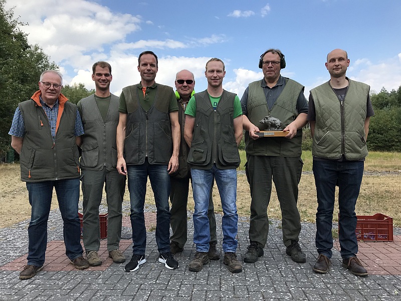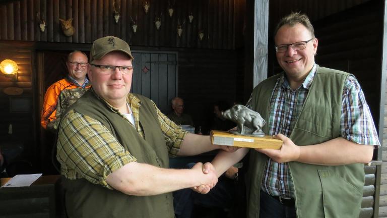 Am besten schnitt dabei im Hegering Milte-Einen Ingo Hartmann mit sehr ordentlichen 310 Punkten ab. Den zweiten Platz teilten sich die Brüder Thomas und Peter Dreimann mit 267 Punkten. Schießobmann Peter Dreimann überreichte die Wandertrophäe beim Abschlussgrillen damit zum dritten Mal an Ingo Hartmann.