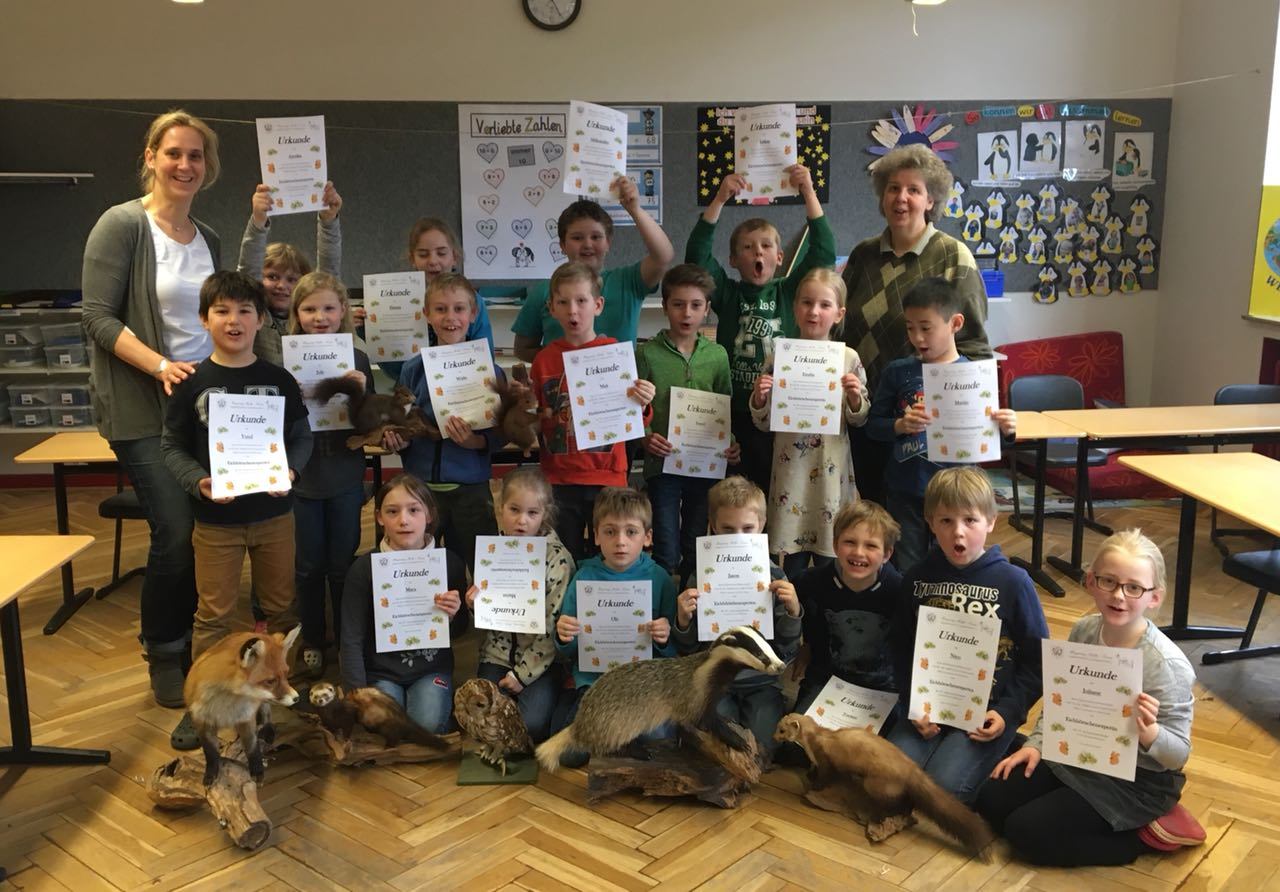 Auch in diesem Jahr stand das heimische Eichhörnchen wieder auf dem Stundenplan der beiden zweiten Schuljahre der Wilhelm-Achtermann-Schule in Milte und Einen. Und so war es kaum verwunderlich, dass die Schülerinnen und Schüler gemeinsam mit ihren Lehrerinnen voller Vorfreude ihre Klassenräume betraten. Über Nacht waren dort zahlreiche Spuren aus dem Lebensraum des Eichhörnchens vorbereit worden. Unter Leitung der Waldpädagogin Theresia Lietmann vom Hegering Milte-Einen erforschten die Schüler und Schülerinnen gemeinsam, wie man Eichhörnchen unterscheidet, wie sie leben, was auf ihrem Speisezettel steht und wie gut sie sich in Wald orientieren können. Auch die Feinde des Eichhörnchens wurden von den Kindern genauestens inspiziert. Hierfür hatte Theresia Lietmann zahlreiche Tierpräparate mitgebracht, die alle intensiv betrachtet und angefasst werden durften. Nach einem äußerst lehrreichen Stationenlauf durften sich alle zur Erinnerung eine kleine Eichhörnchenbastelei gestalten. Zum Abschluss dieses ganz besonderen Sachkundeunterrichts, wurden alle Schüler und ihre Lehrerinnen jeweils mit einer Eichhörnchenexperten-Urkunde ausgezeichnet, weil sie sich nun besonders gut mit dem Kobold des Waldes auskennen.